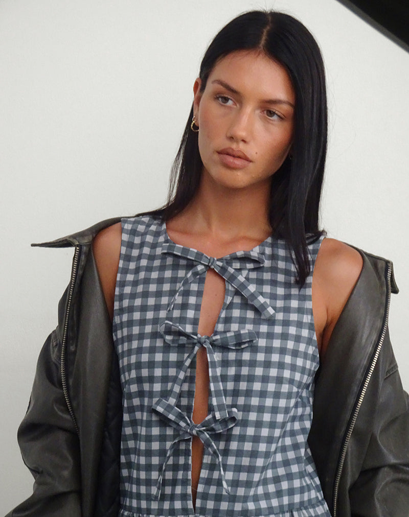 Gingham season wouldn't be complete without our Prelith dress. A loose smock midi dress, Prelith features a sleeveless design, crew neckline and gathered waistline. Complete with a three bow fastening down the centre and finished in a black grey tonal gingham. Style with our Cavita jacket.