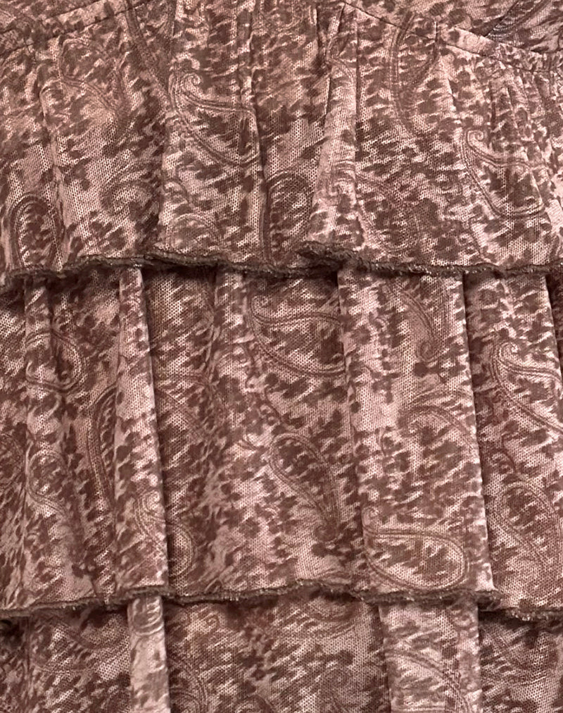 The Ratilu top in vintage paisley print on a fully lined mesh fabric base. Displaying a strappy ruffle cami design with thin straps, a plunge neckline and layered ruffles on the body. Complete the look with our denim skirt.