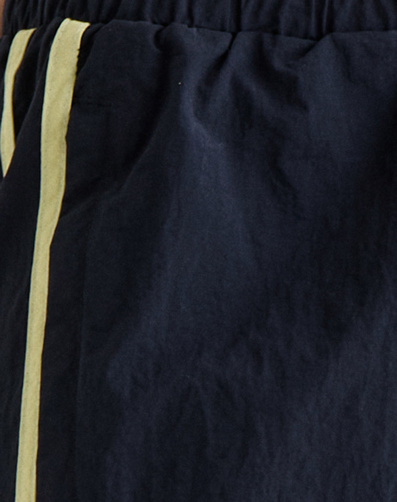 The Riu short in navy nylon features two yellow stripes down either side. In a mini length with an elasticated waistband and a drawcord for a customizable fit.