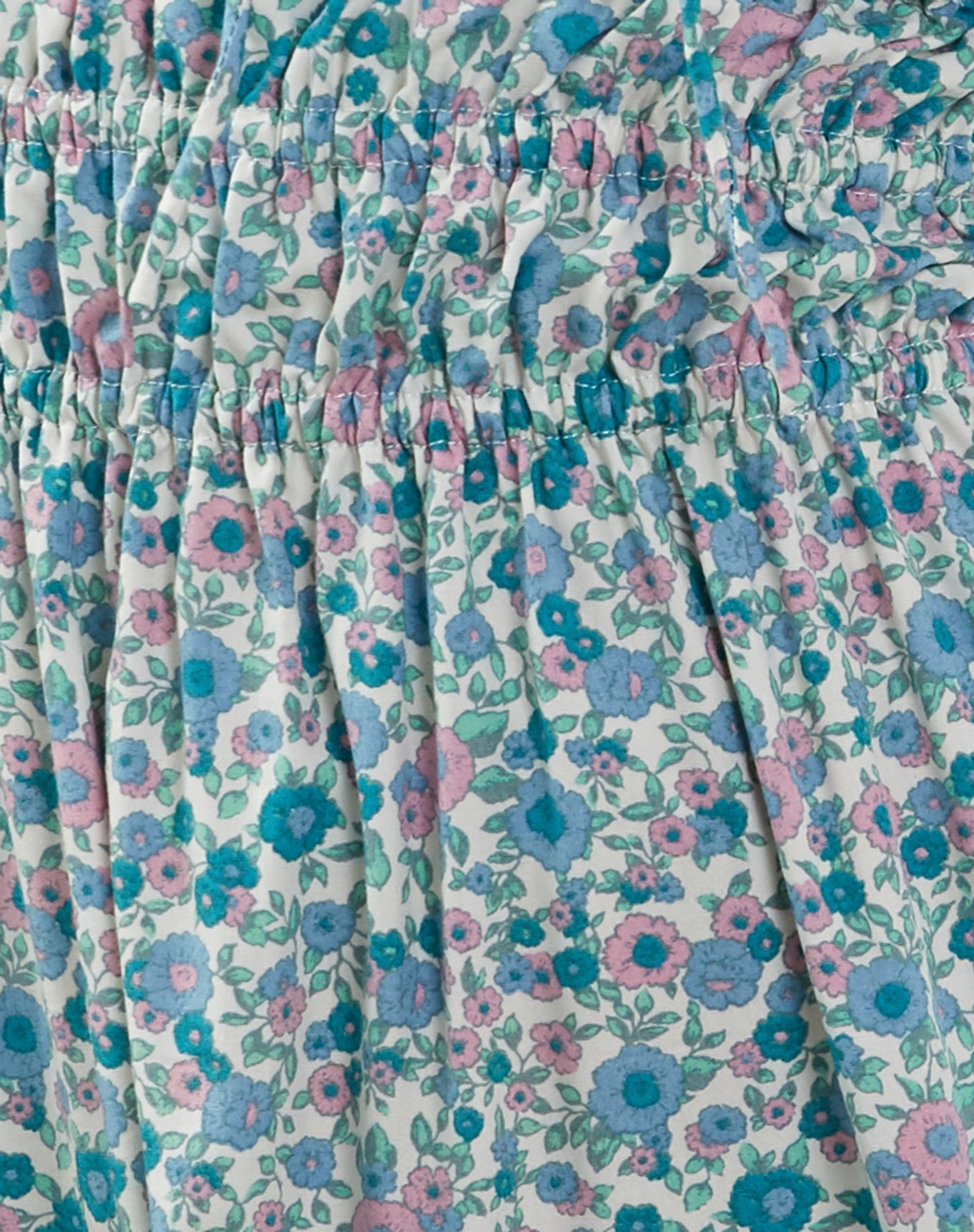The Rosmilly Dress features a loose, mini fit with an elasticated waist, square neckline and cap sleeves with frills in a woven fabric. Detailed with a blue floral print and cut-out to bust with tie fastening.