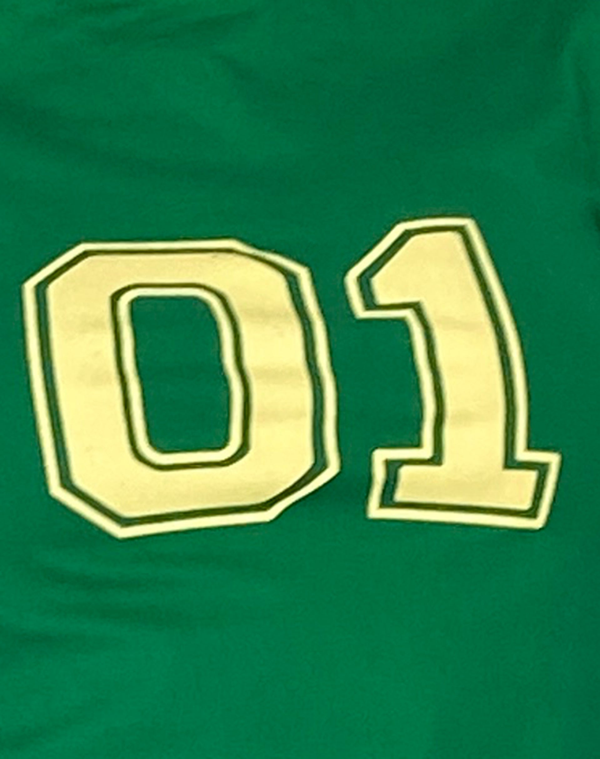 In a green jersey fabric, the Salda top features a bodycon fit with a regular hem, shorts sleeves and a crew neckline. Complete with yellow binding and a bold numeric sports logo centre front.