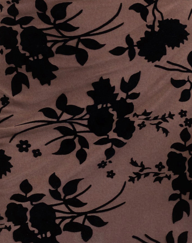 In a floral flock brown fully lined mesh, the Sevila dress features a bodycon design with a mini length hem, long flared sleeves and a boat neckline. Complete with a lettuce hem.