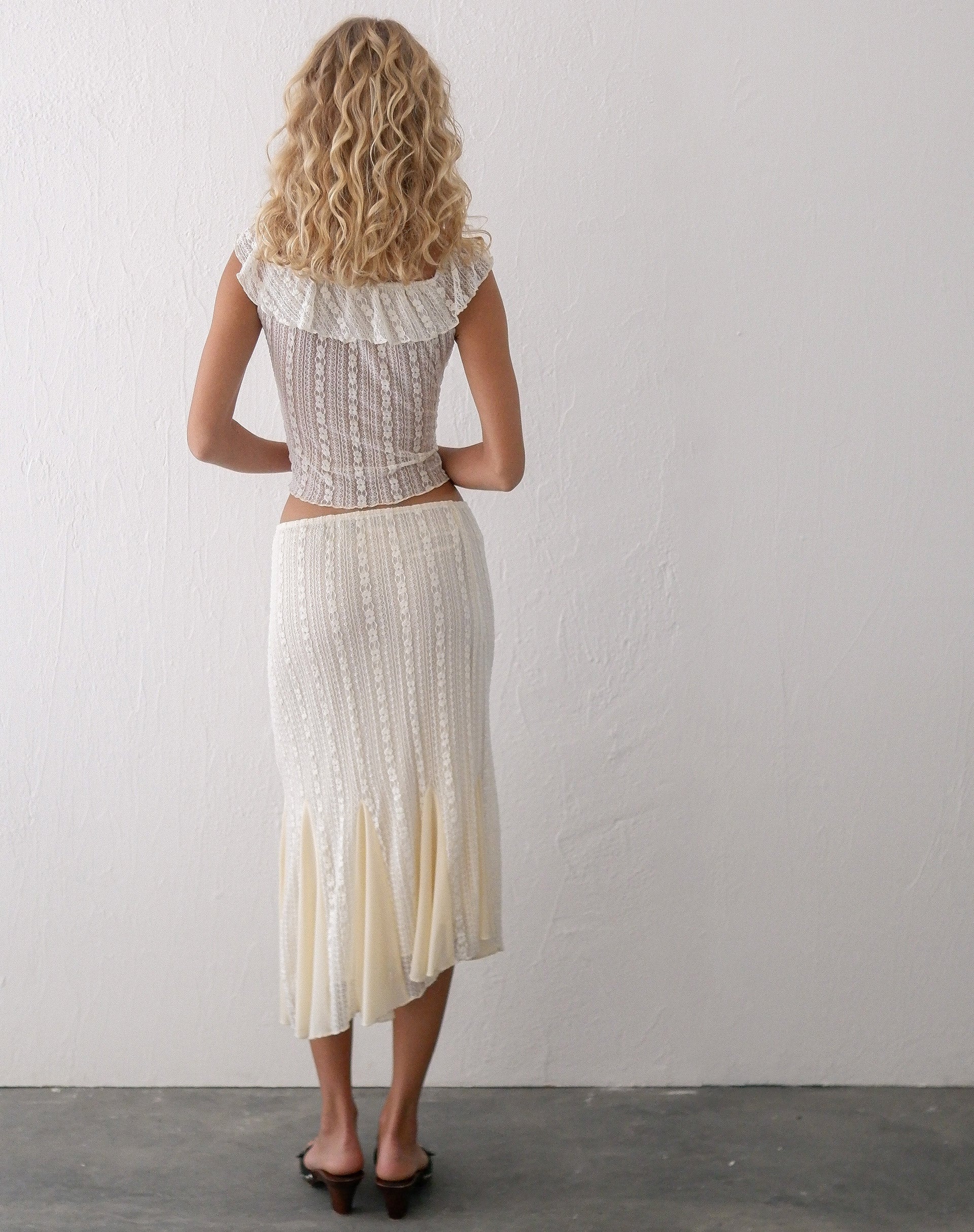 Turn heads this summer with our Simran Top. This stunning top features an off-shoulder bardot-style fit with a large ruffle across the neckline, with a frill on the right chest for added detail in a cream lace. Pair with our Betharia skirt.
