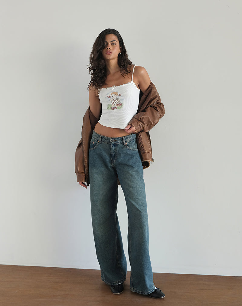 Slim fit vest top in regular length, Suna features thin cami straps and a scoop neckline in an off white ribbed fabric, finished with a picot trim along the neckline and arm hole, a centre front bow and a colourful printed 'little girl' graphic. Complete the look with our Renha shorts.