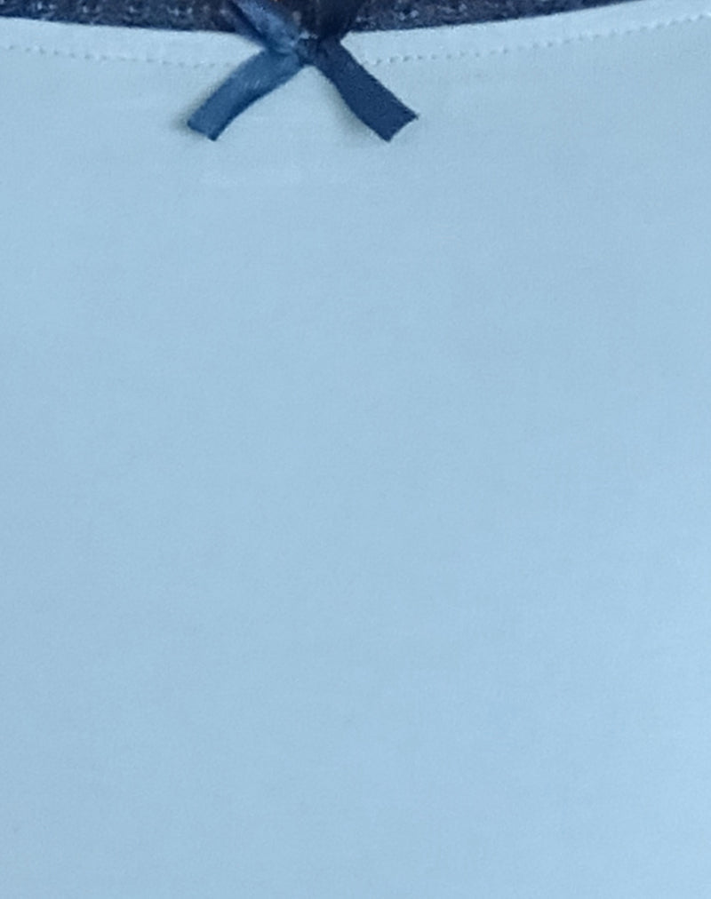 Slim fit vest top in regular length with thin cami straps and scoop neckline in a nantucket blue ribbed fabric, finished with a picot trim along the neckline and arm hole, a centre front bow.