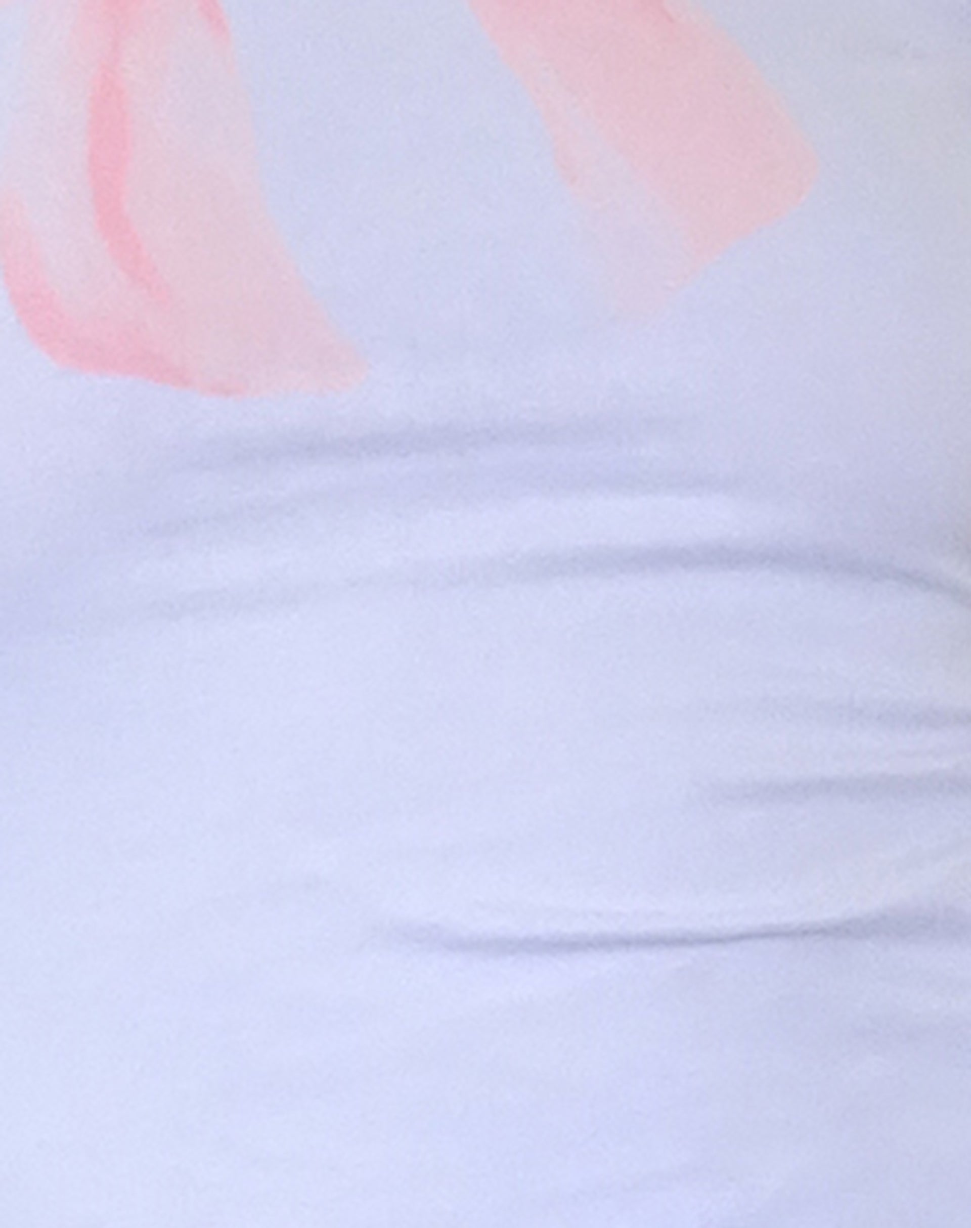 In a white jersey fabric, the Sutin tee features short sleeves, a crew neckline and a slim fit with a bow graphic in pink. Paired with our Roomy jean.