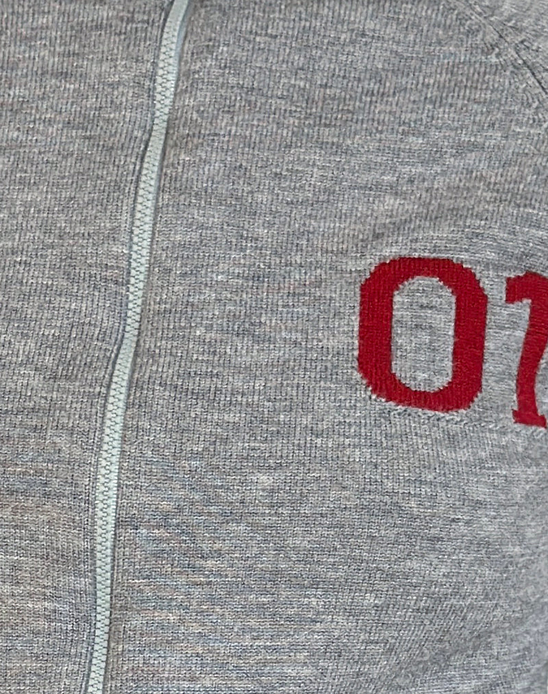 Get back to school ready in the Tacita jacket. In a grey flat knit fabric, the Tacita displays a bodycon fit, high neckline and long sleeves. Finished with a long zip up feature, red contrast detailing and a '01' motif. Paired with our Trisma skirt.