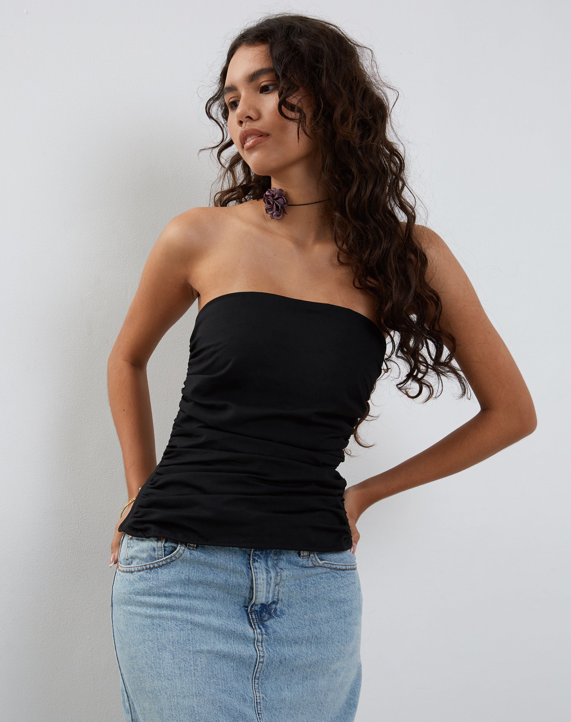 Not your usual tube top. The Tahari in black has a bandeau neckline and features adjustable bow ties at the back. We love to wear with our Denim Maxi Skirt.
