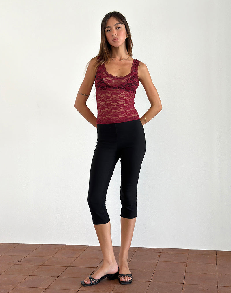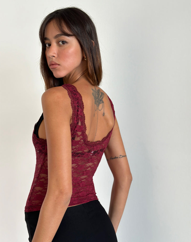 In a burgundy orchid lace fabric, the Tahoa top features a regular hem with a bodycon fit, thick straps and a scoop neckline with a lace trim. Best paired with the Asla capri trouser.