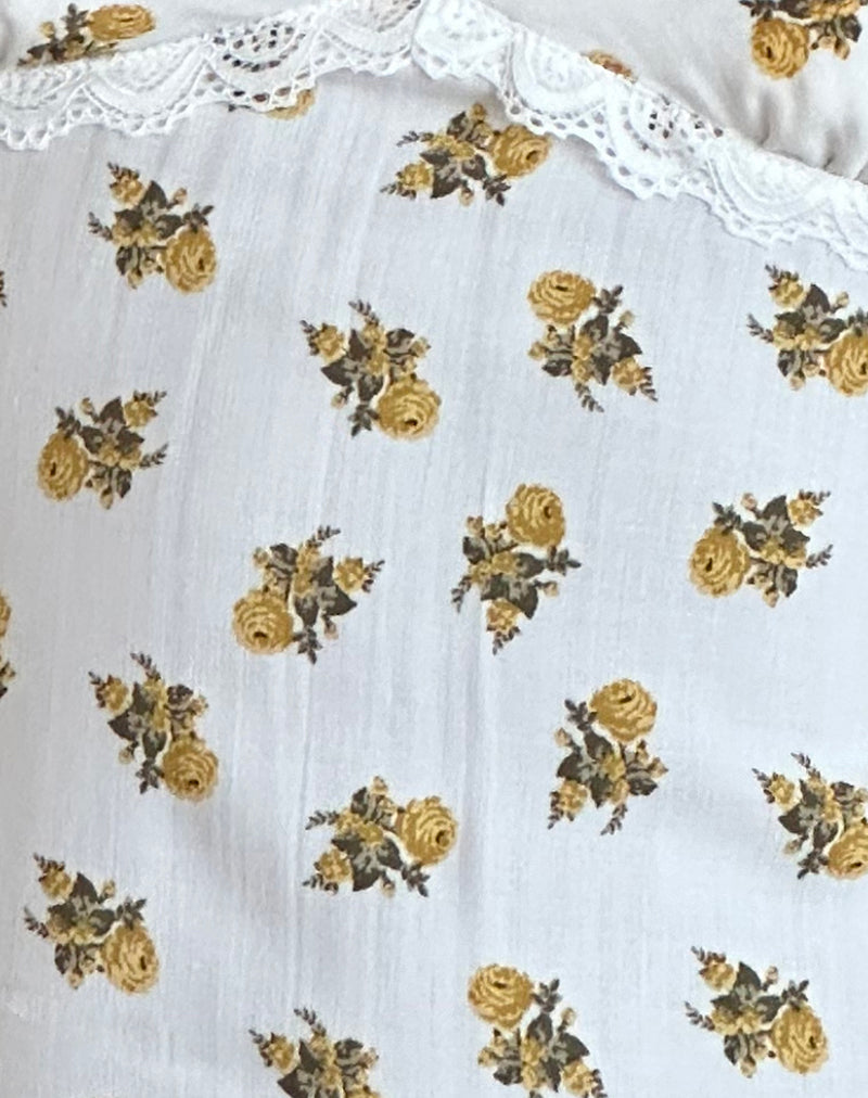 Cami mini dress, Tavita features thin adjustable straps, triangle cup, loose fit body and a deep ruffle hem. Finished with a concealed zip and ivory lace trim underneath the bust and above the ruffle hem in a ivory lightweight non stretch viscose printed fabric with a muted yellow floral.