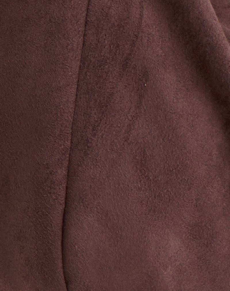 The Tetira bag in a brown suede fabric. Featuring resin tortoise shell rings on either side and a slouchy style. Finished with a metal clasp inside for a secure finish.
