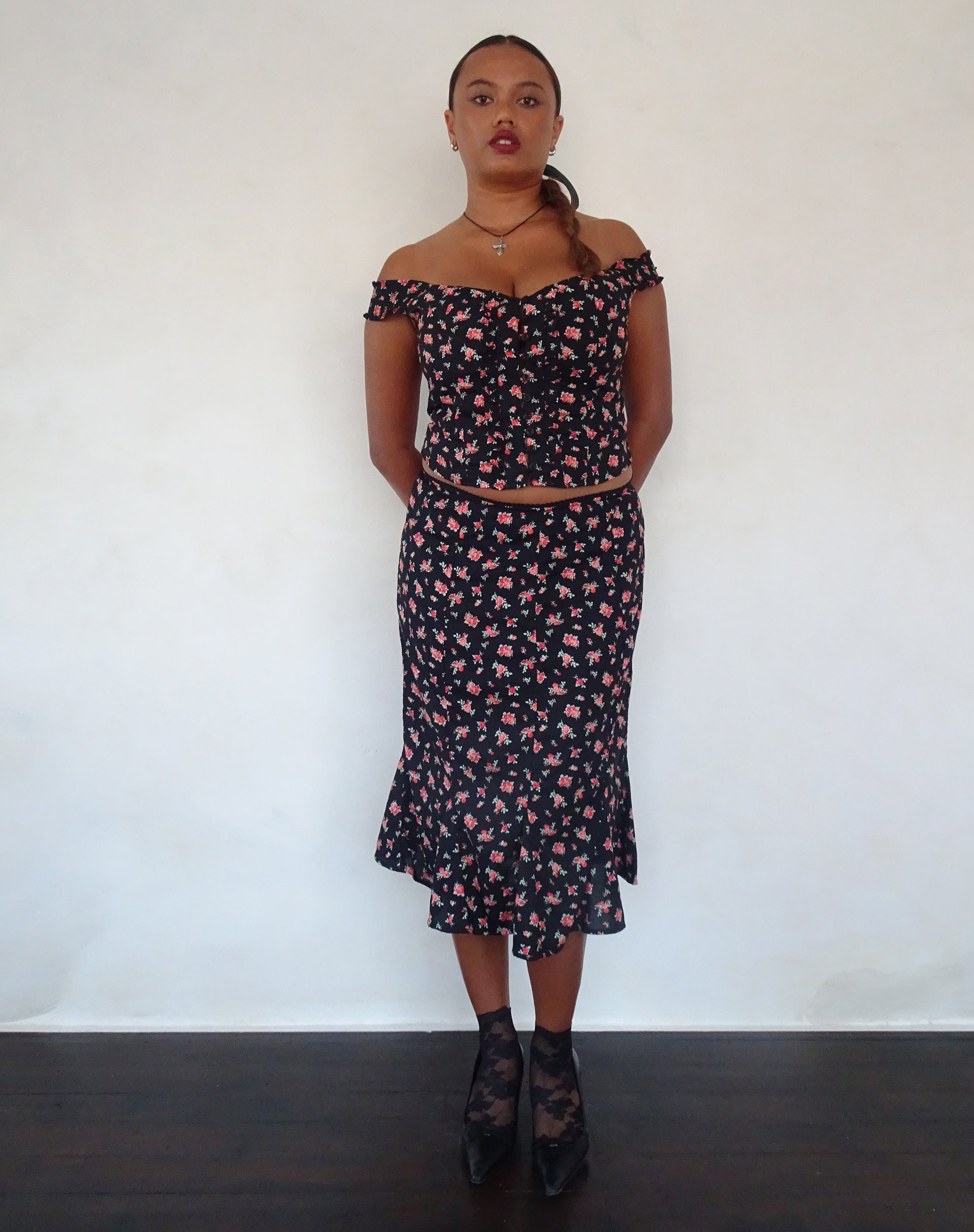 Cropped bardot top with off-the-shoulder sleeves, in a black floral rose print. We love to match with our Sima Skirt.