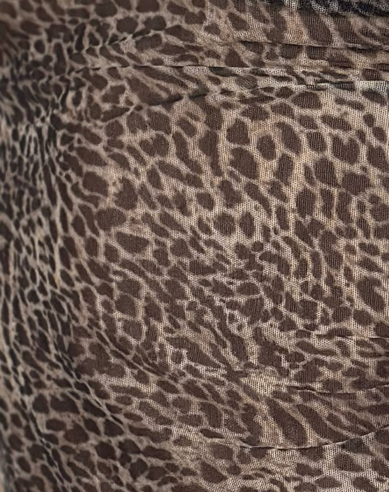The Ulyana cami top in mesh classic brown leopard print, features thin black cami straps with lace and picot trim along the v-neckline. Complete with a small bow. Match the look with our Sarua thong.