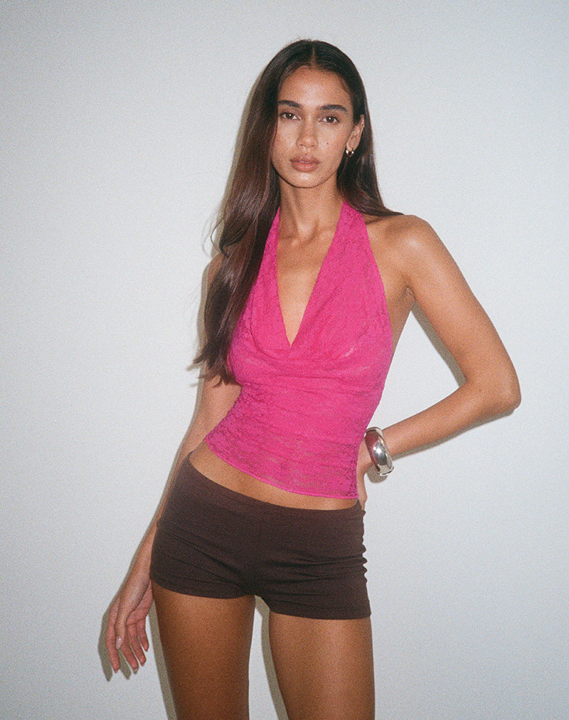 The Varys top in a hot pink orchid lace fabric. Featuring a cowl neck, sleeveless design with tie neck and cut out back design. Pair with the Eunia shorts.