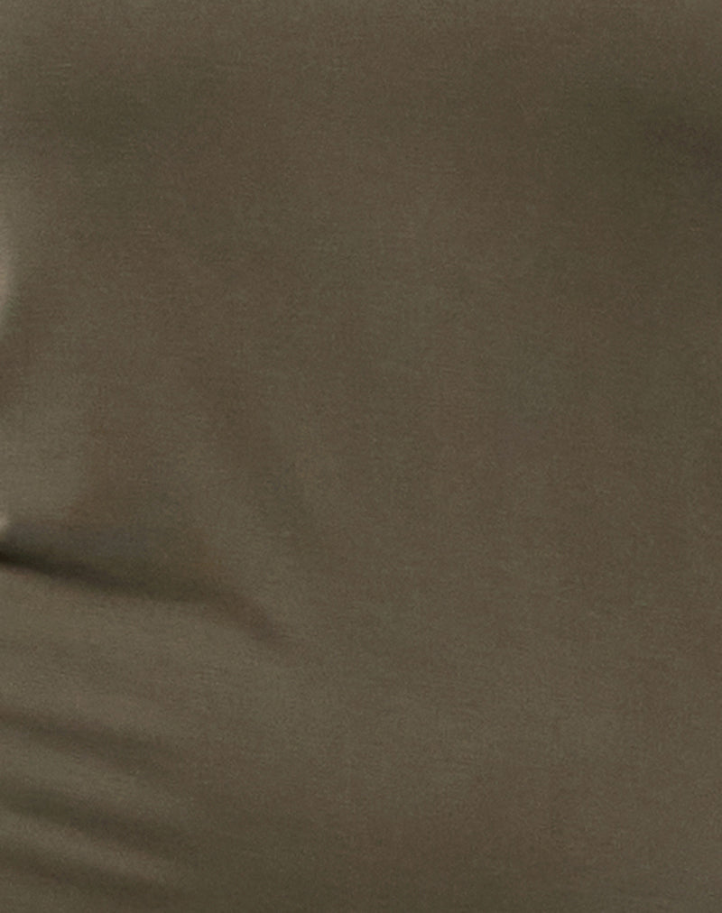 The Vondra mini dress in khaki eco cupro fabric. Boasting an A-line hem, a twisted strap and a dropped left sleeve for an asymmetrical look.