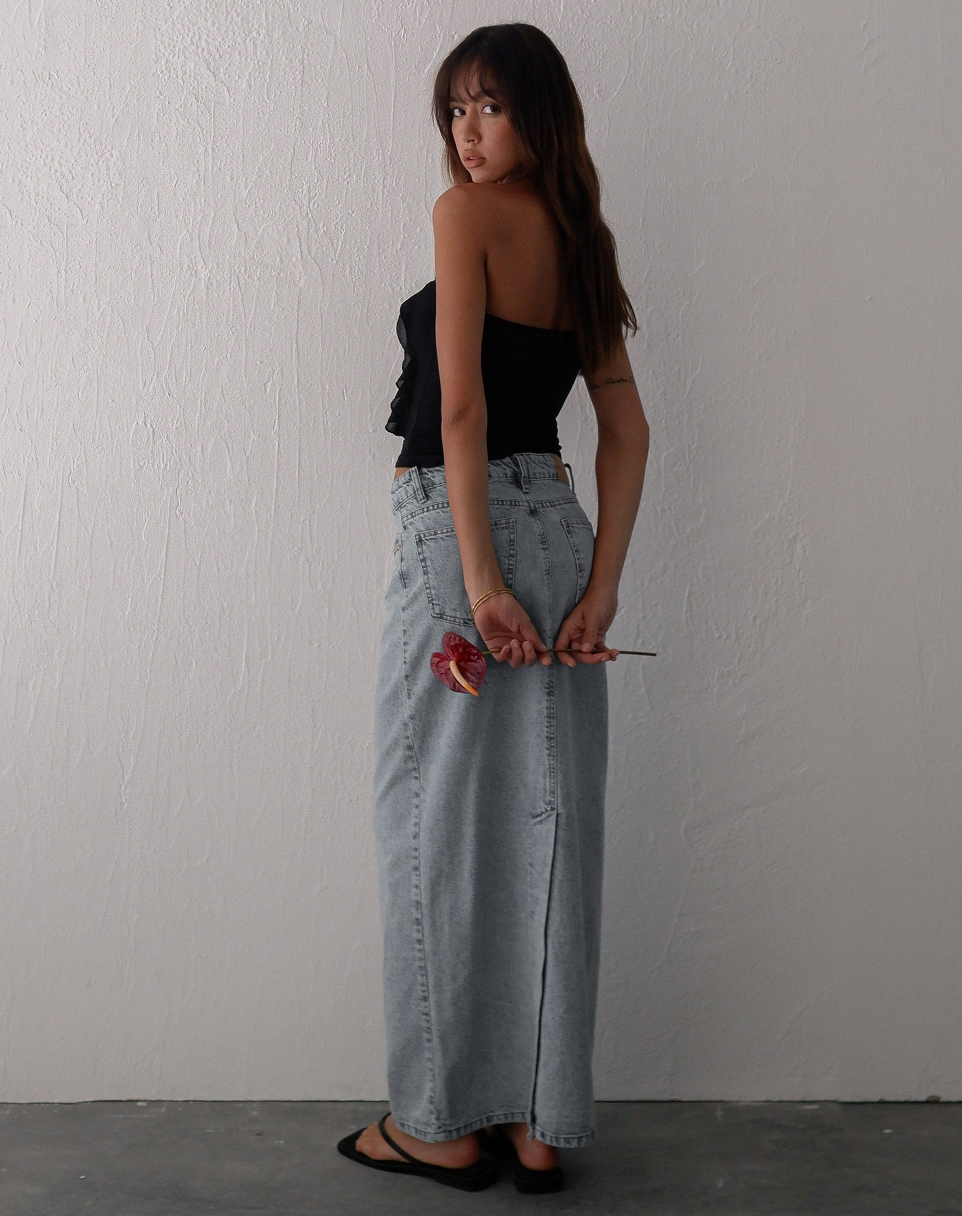 In black, the Wayan bandeau top features an asymmetric chiffon frill at the front, with stretch tailoring fabric at the back for a comfortable and flattering fit. Pair with our Low rise denim maxi for the perfect fit.