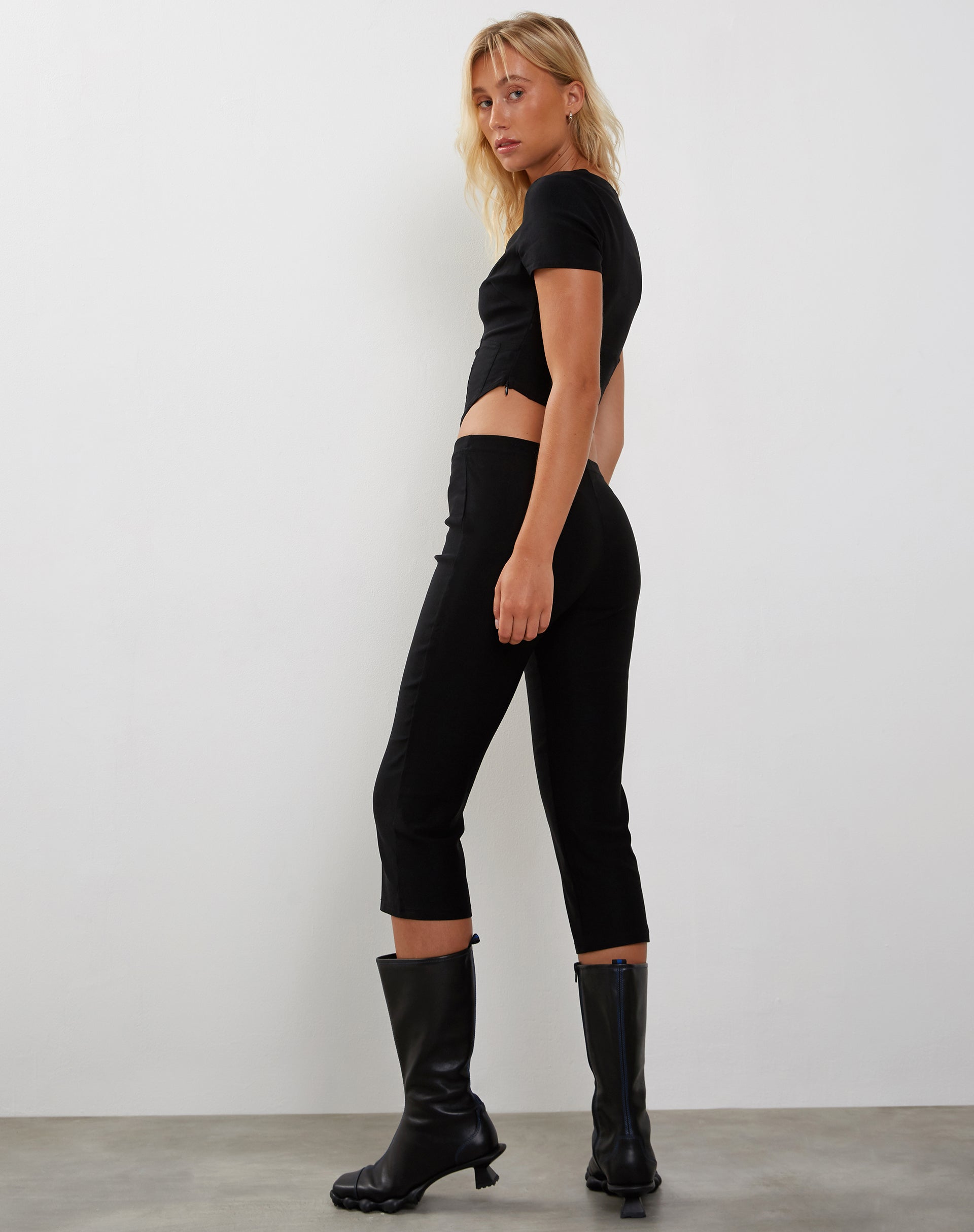 In a black stretch tailoring fabric, our Yahia top features a structured corset design with a slim, cropped fit, short sleeves, and a crew neckline. Completed with key hole cut-outs to bust.