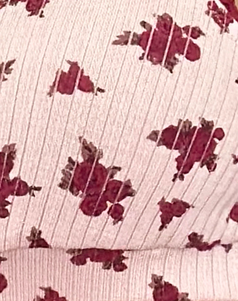 Your lingerie collection is calling out for a floral set. The Yanas bralette features thin adjustable straps and a super cropped fit in a pink ribbed fabric with a floral fantasy print. Complete with a picot trim along neckline. Styled with the matching Yinis knickers.