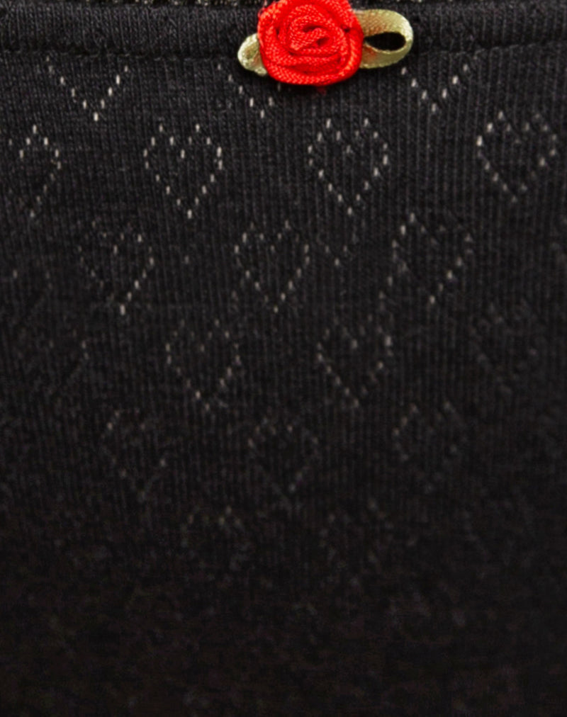 The Yinis Knickers crafted from soft black pointelle fabric, featuring a delicate picot trim and a red rose accent at the centre. Pair with our matching Yanas bra.
