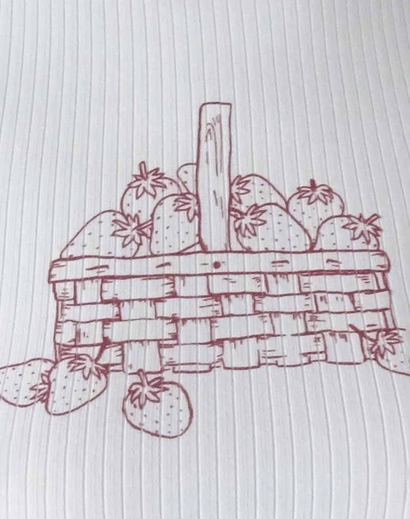 The Zagy Tee, short sleeve top with a regular length finished with a lace trim along the neckline in a off white soft lycra base and a red printed 'strawberry basket' graphic. Pair with our Adinda skirt.